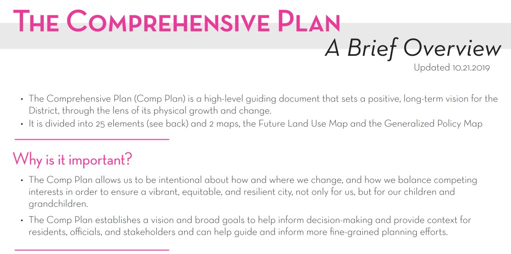 The Comprehensive Plan (Comp Plan) is a high-level guiding document that sets a positive, long-term vision for the District. It was written in 2006 and amended in 2011. However, given how our city has changed since then, it is important that we amend it to reflect today’s conditions, opportunities, and challenges. This includes housing, equity, resilience and public resources. It is important because it: